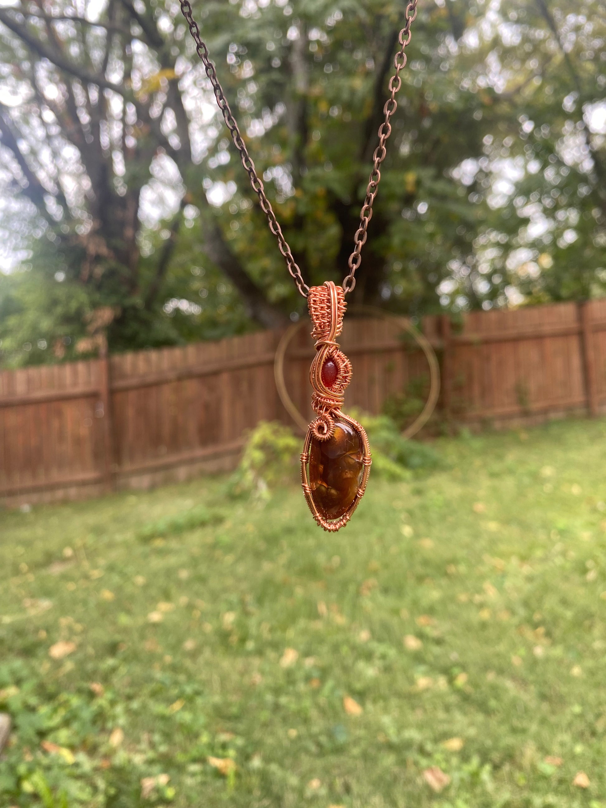 This pendant is a combination of fire agate and carnelian. Together they have a vibrant energy that boosts creativity and confidence. They help to energize and empower the wearer. Fire agate helps boost our youthful energy and encourages healthy choices. Carnelian is a stone of confidence.
