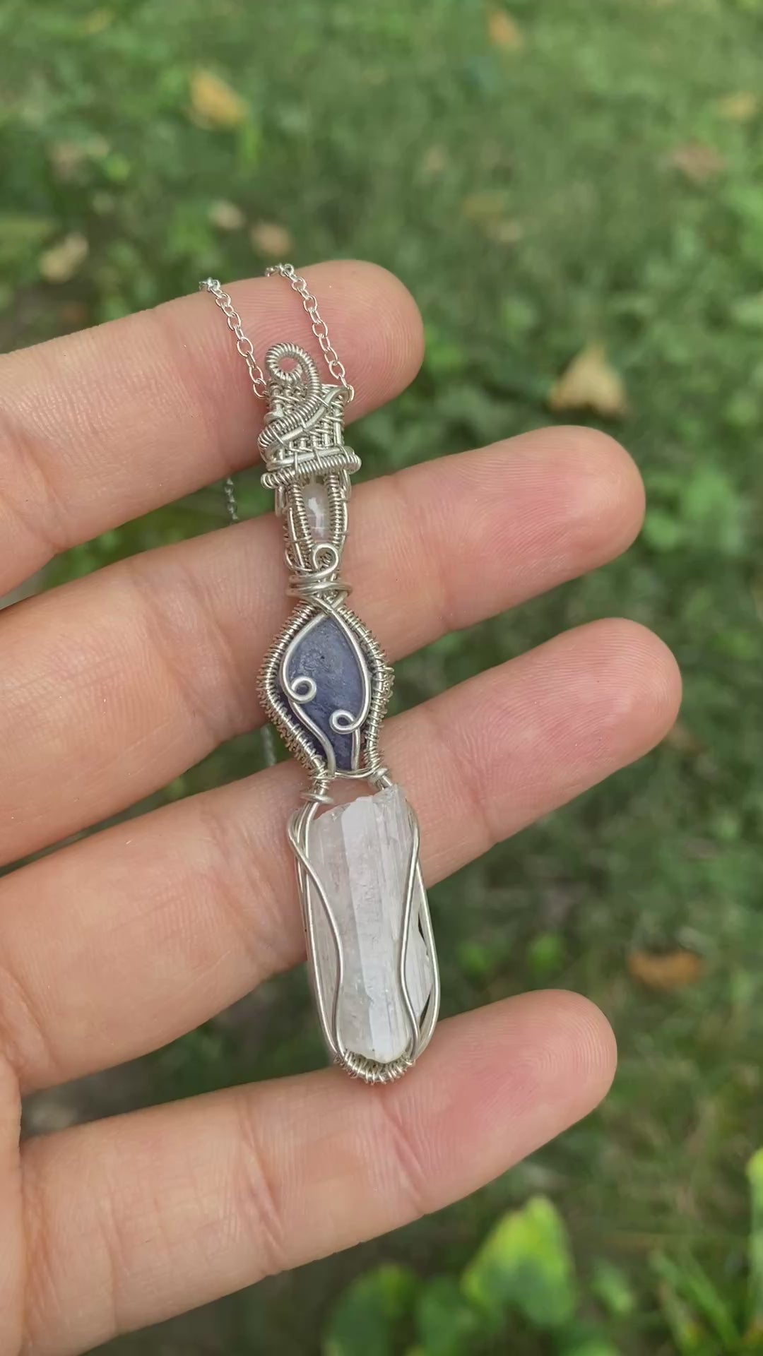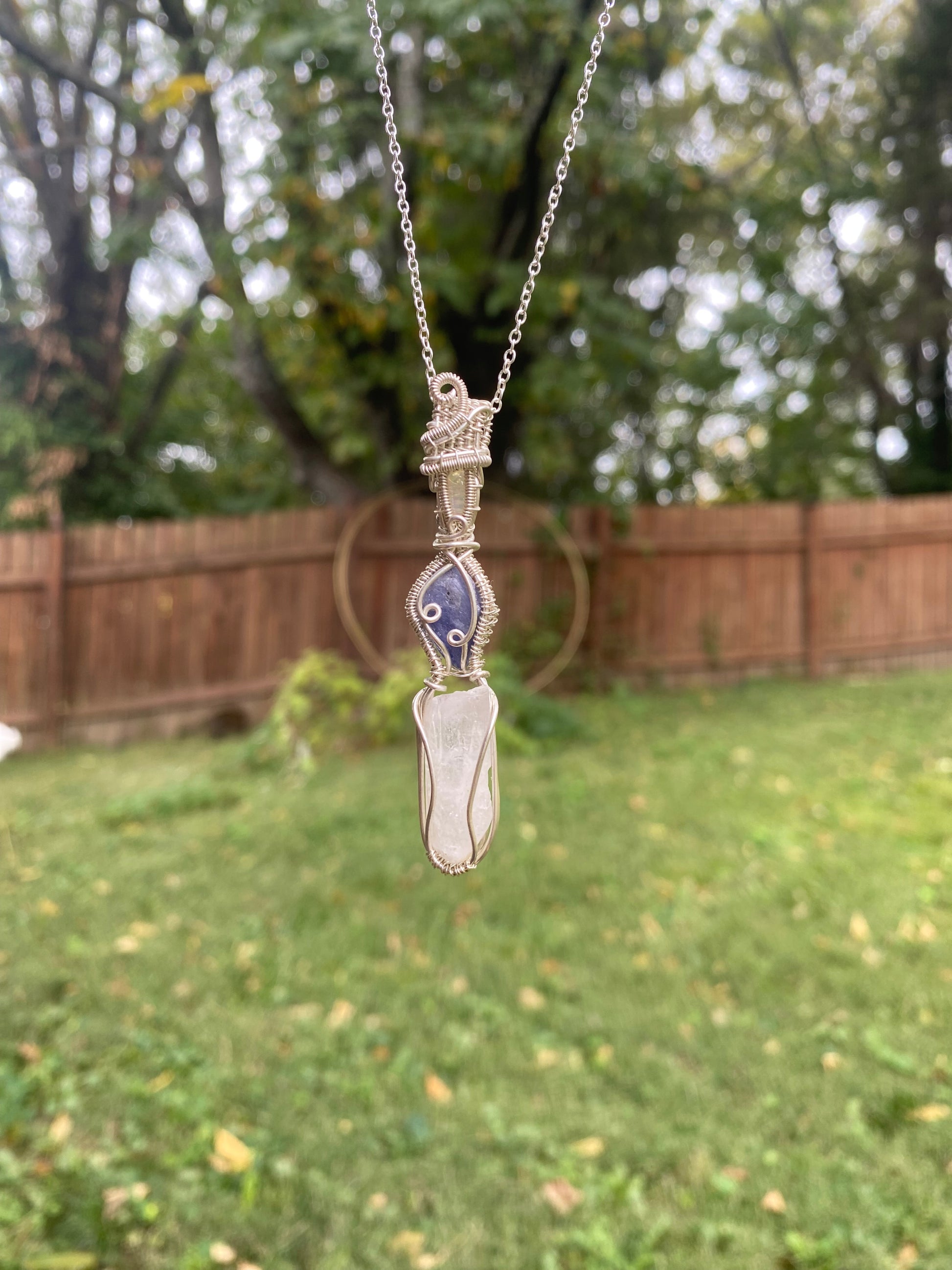 This pendant is approximately 2.75"x.5" and wrapped in sterling silver wire. Appendant arrives on an 18" plated chain that is easy to swap out.