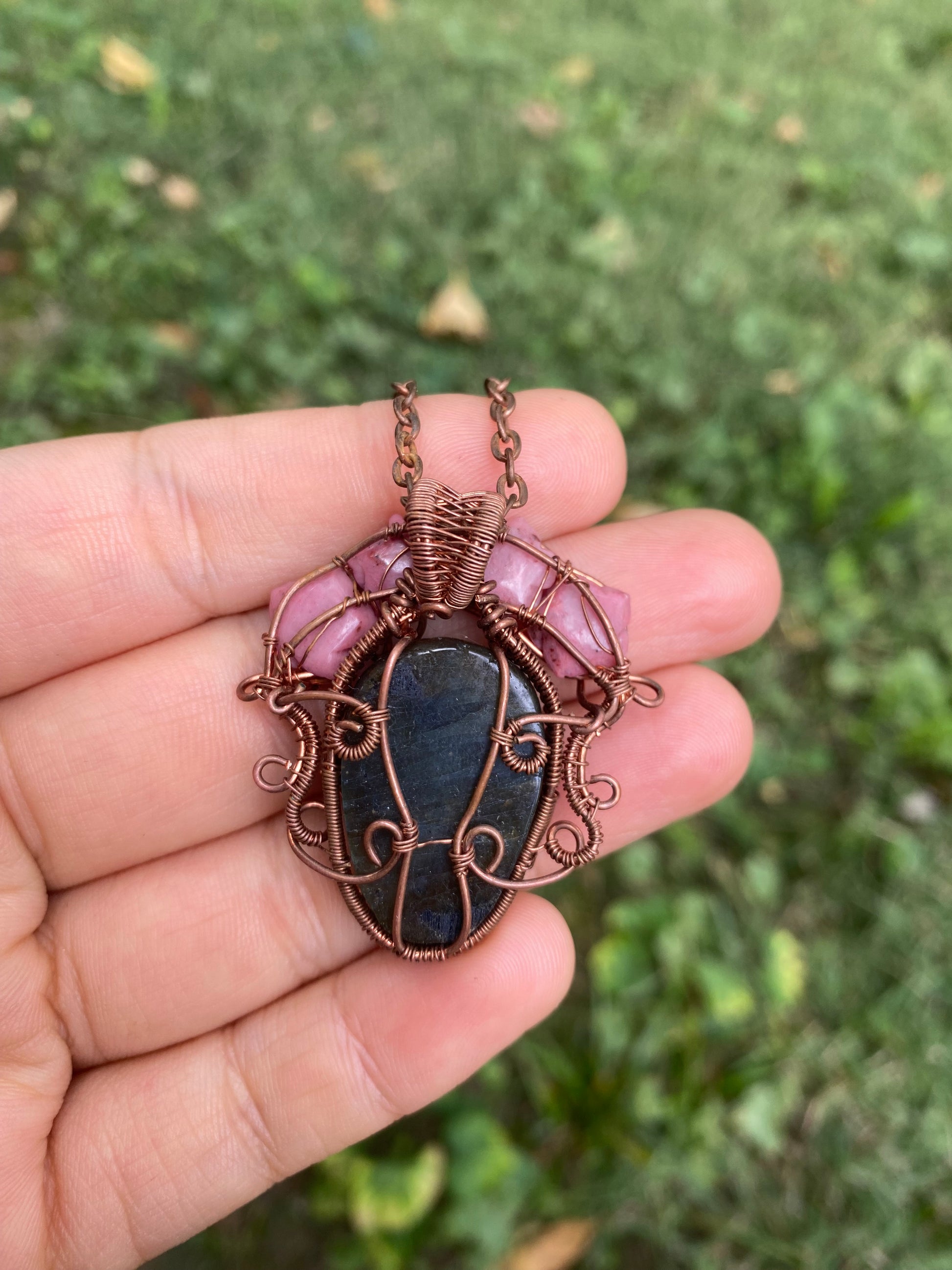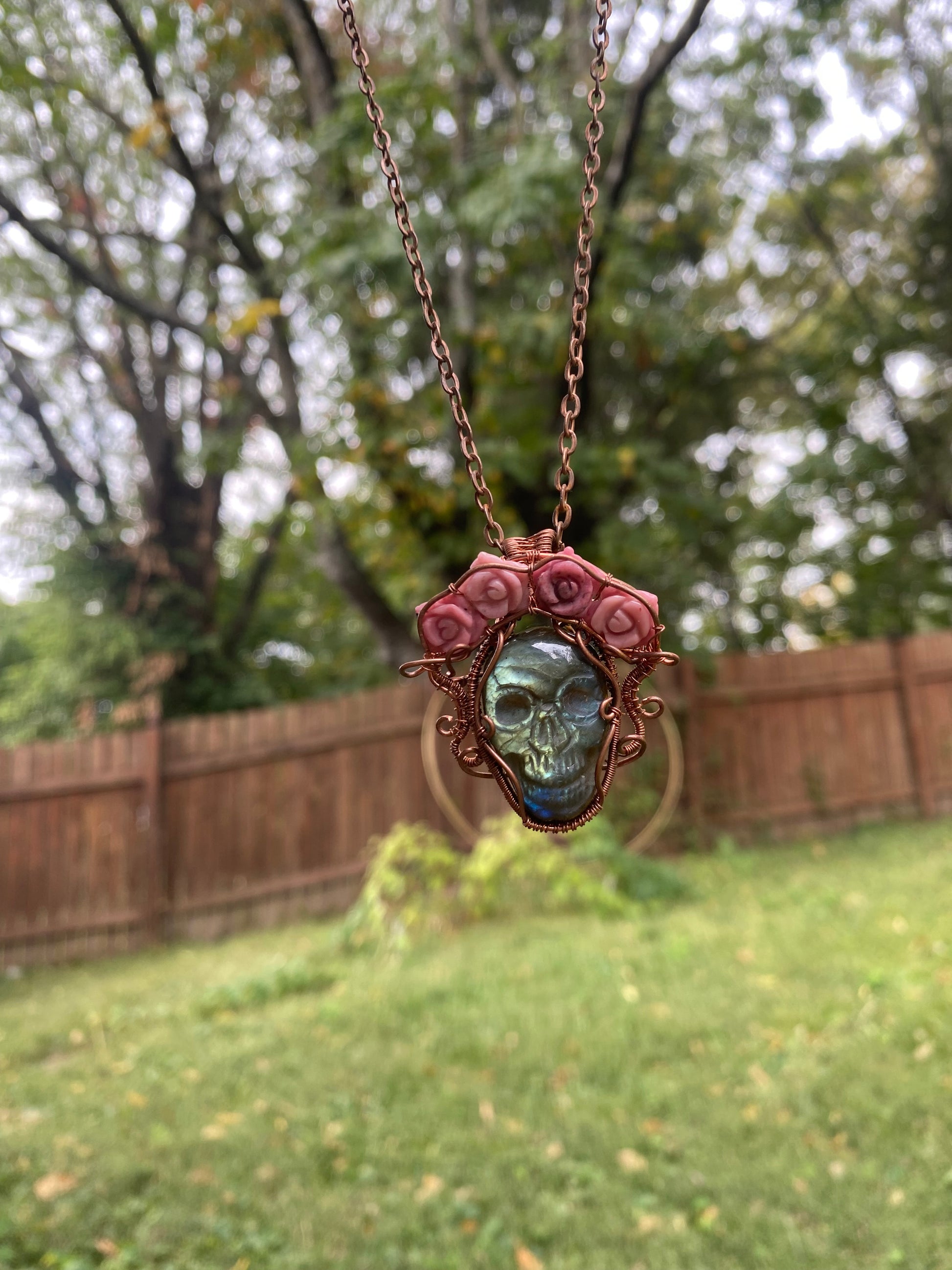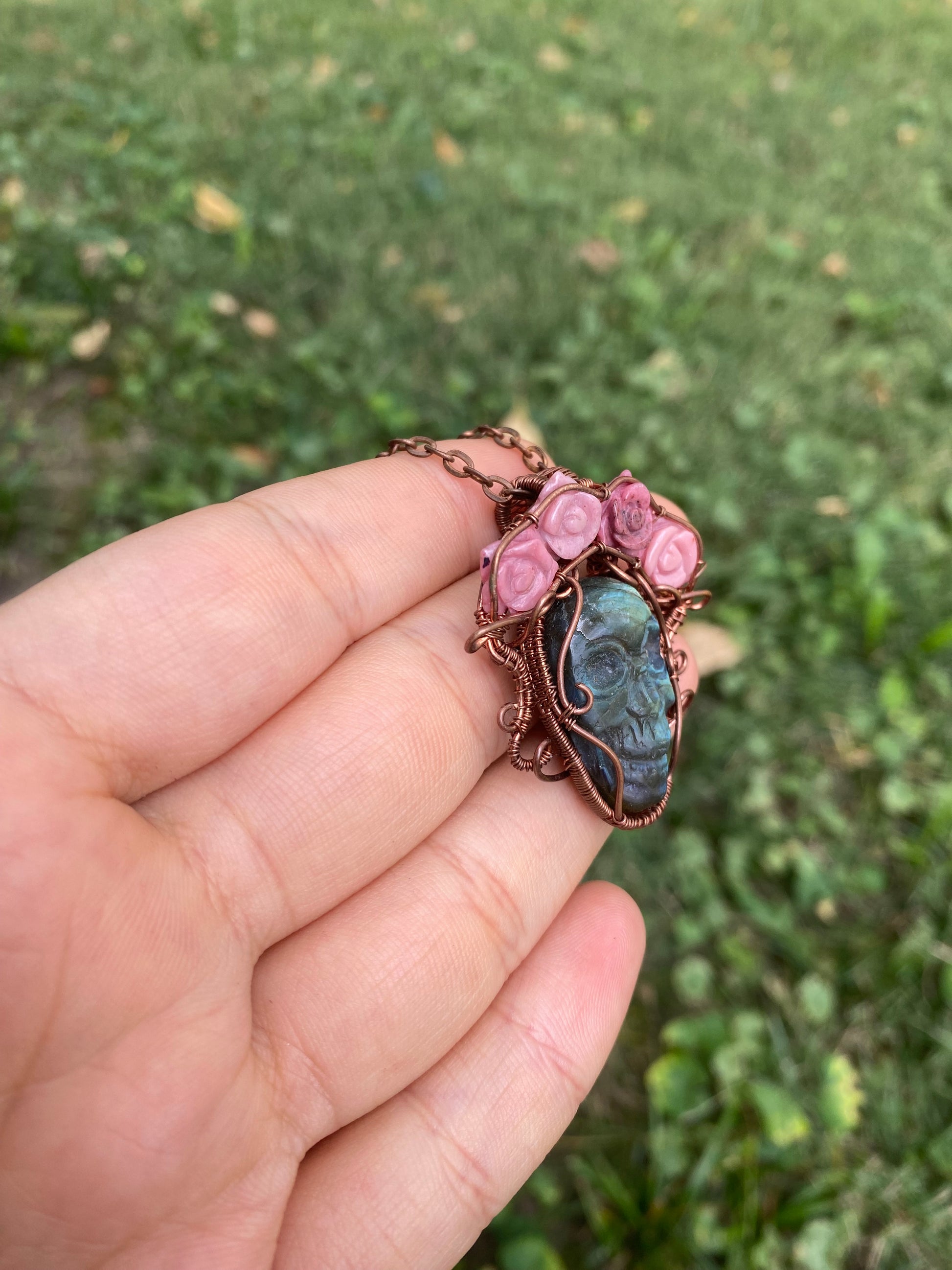This pendant honors the Day of the Dead with a skull carved from Labradorite and a flower crown of Rhodonite roses.