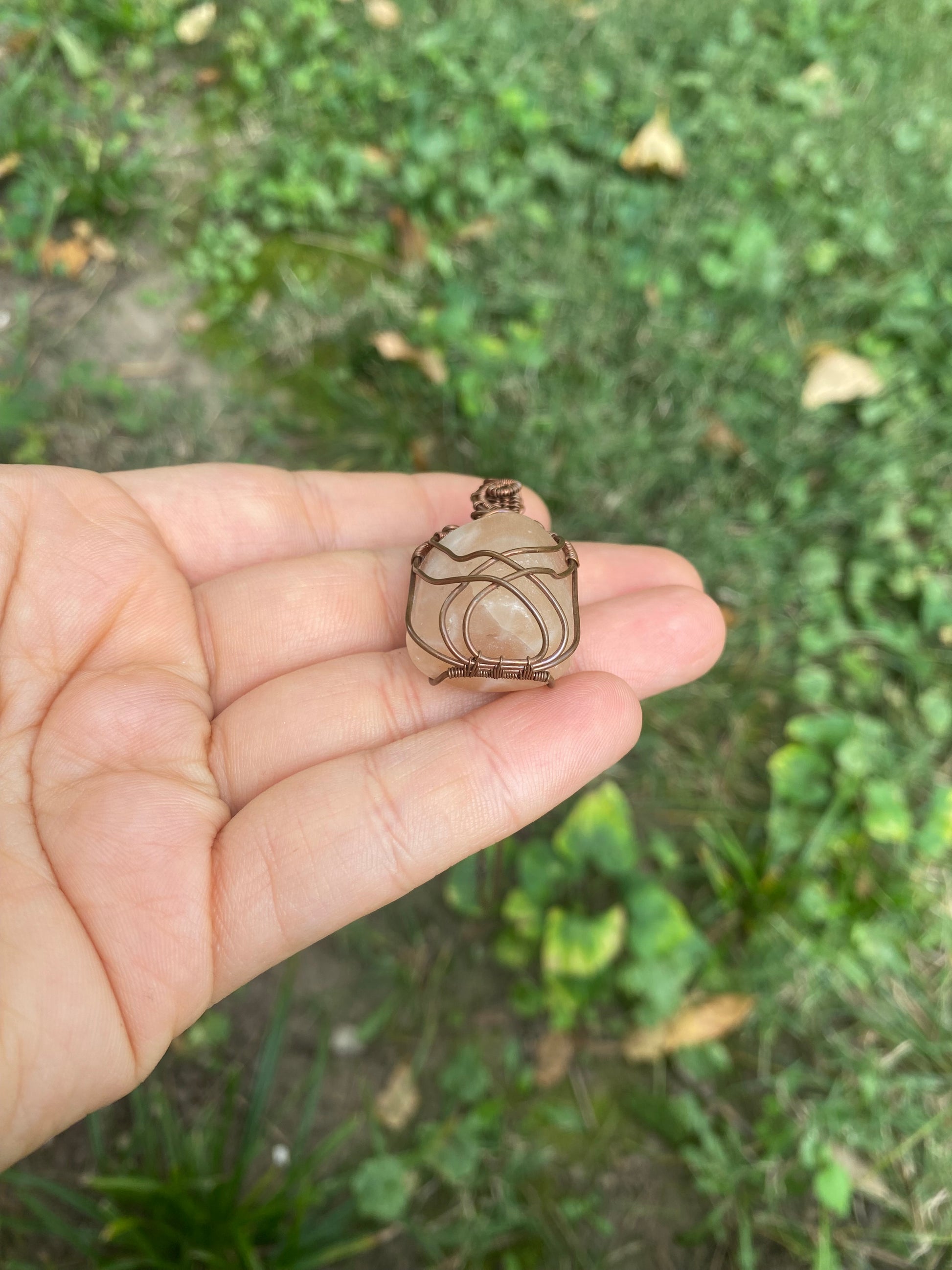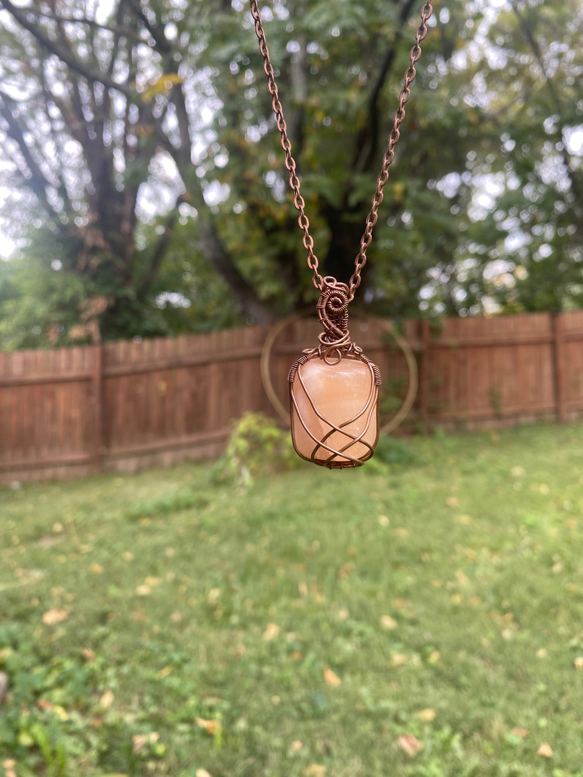 Pendant is approximately 1.75" x .75" and is wrapped in bare copper, it will oxidize over time. Pendant comes on a 20" chain that is easy to swap out.