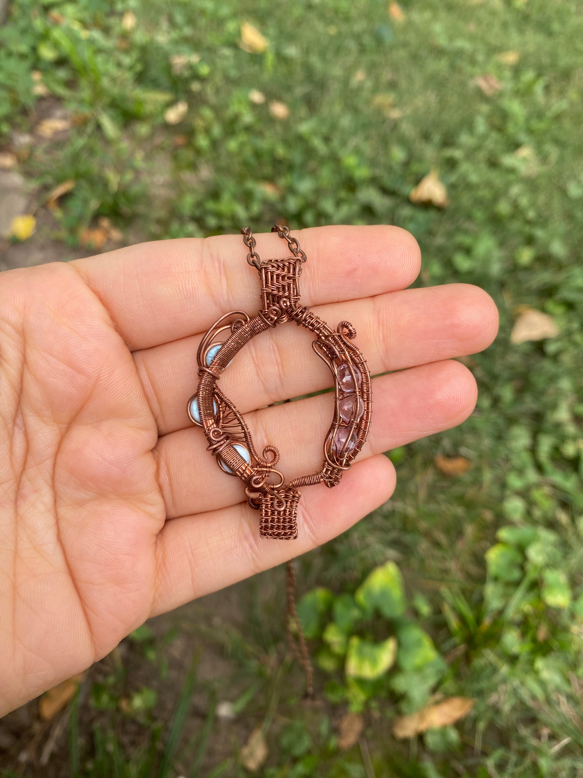 Pendant is approximately 2.5" x 1.5" wrapped in bare copper. Pendant arrives on a 20" chain that is easy to swap out.