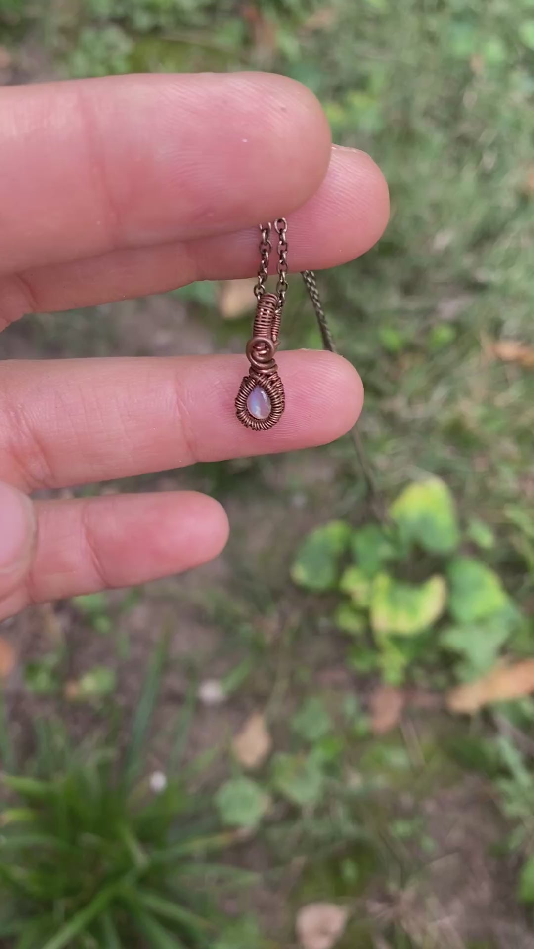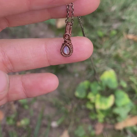 Pendant is approximately .5" x .25" wrapped in bare copper, it will oxidize over time. Pendant arrives on 16"-18" chain that is easy to swap out.