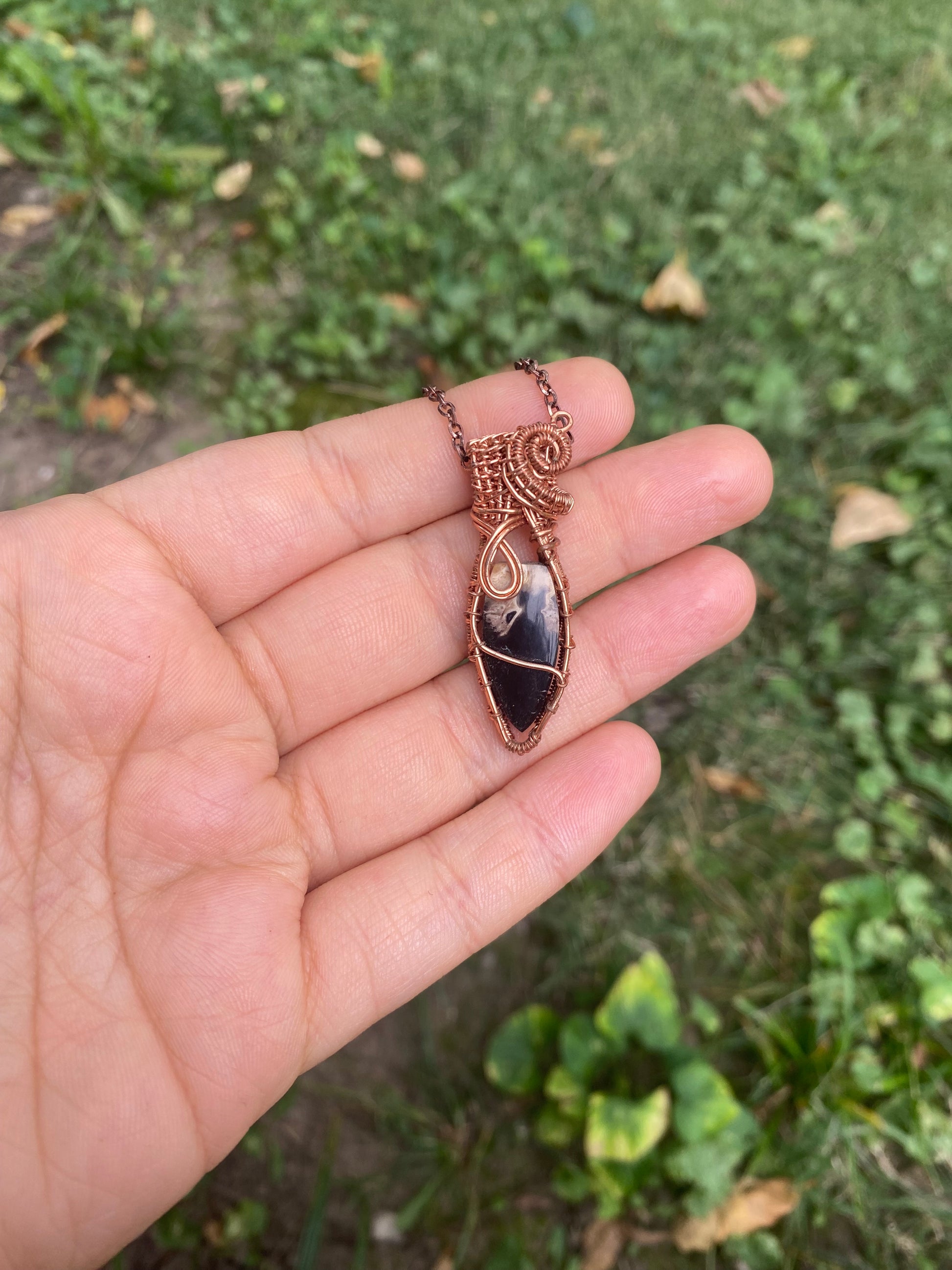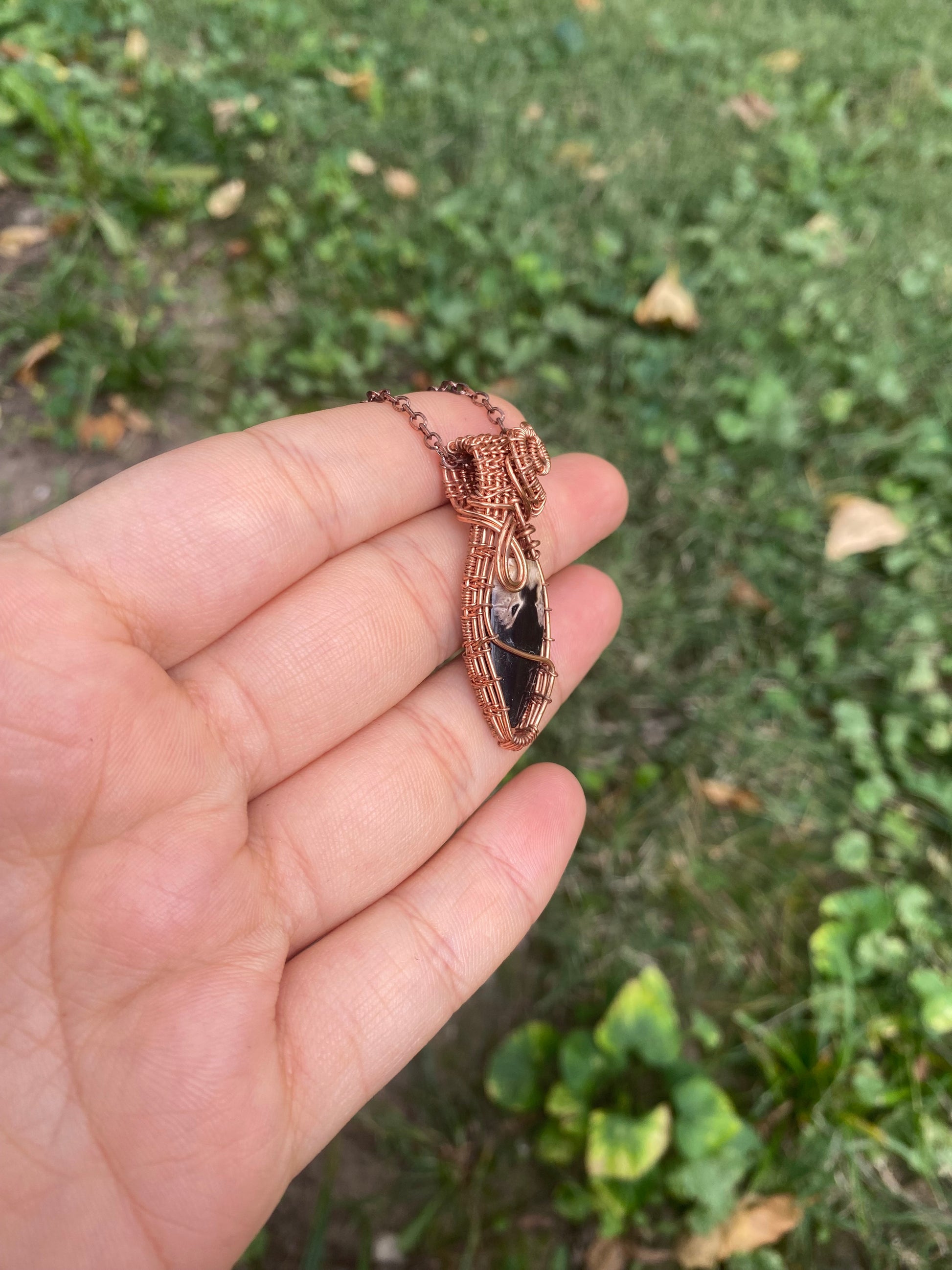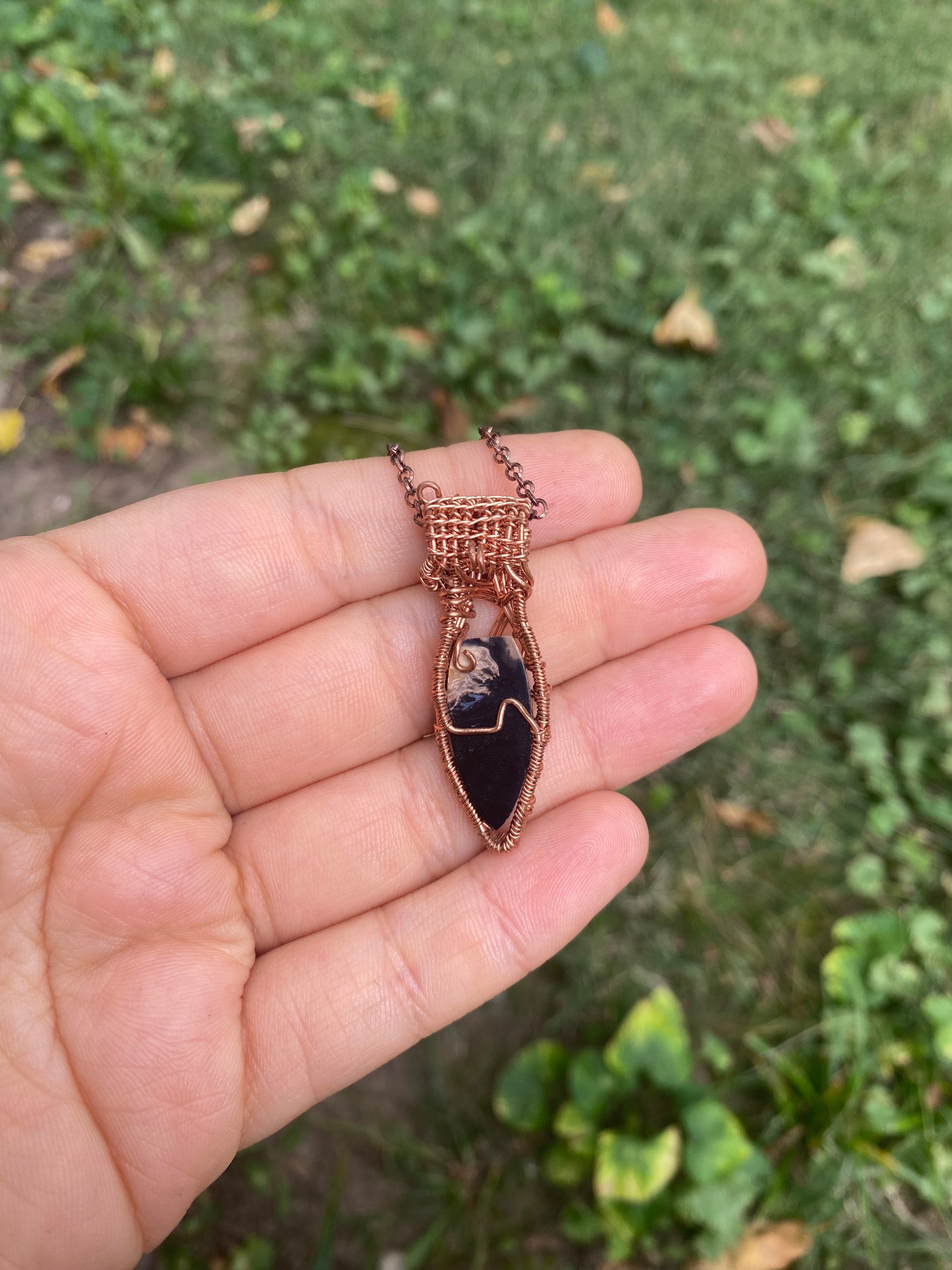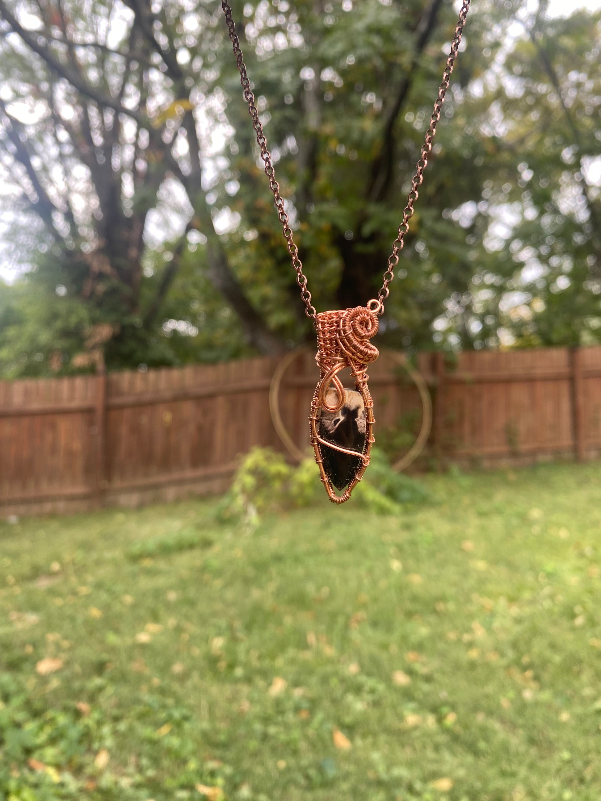 Pendant is approximately 2" x .5" and is wrapped in bare copper, it will oxidize over time. Pendant comes on a 18" chain that is easy to swap out.