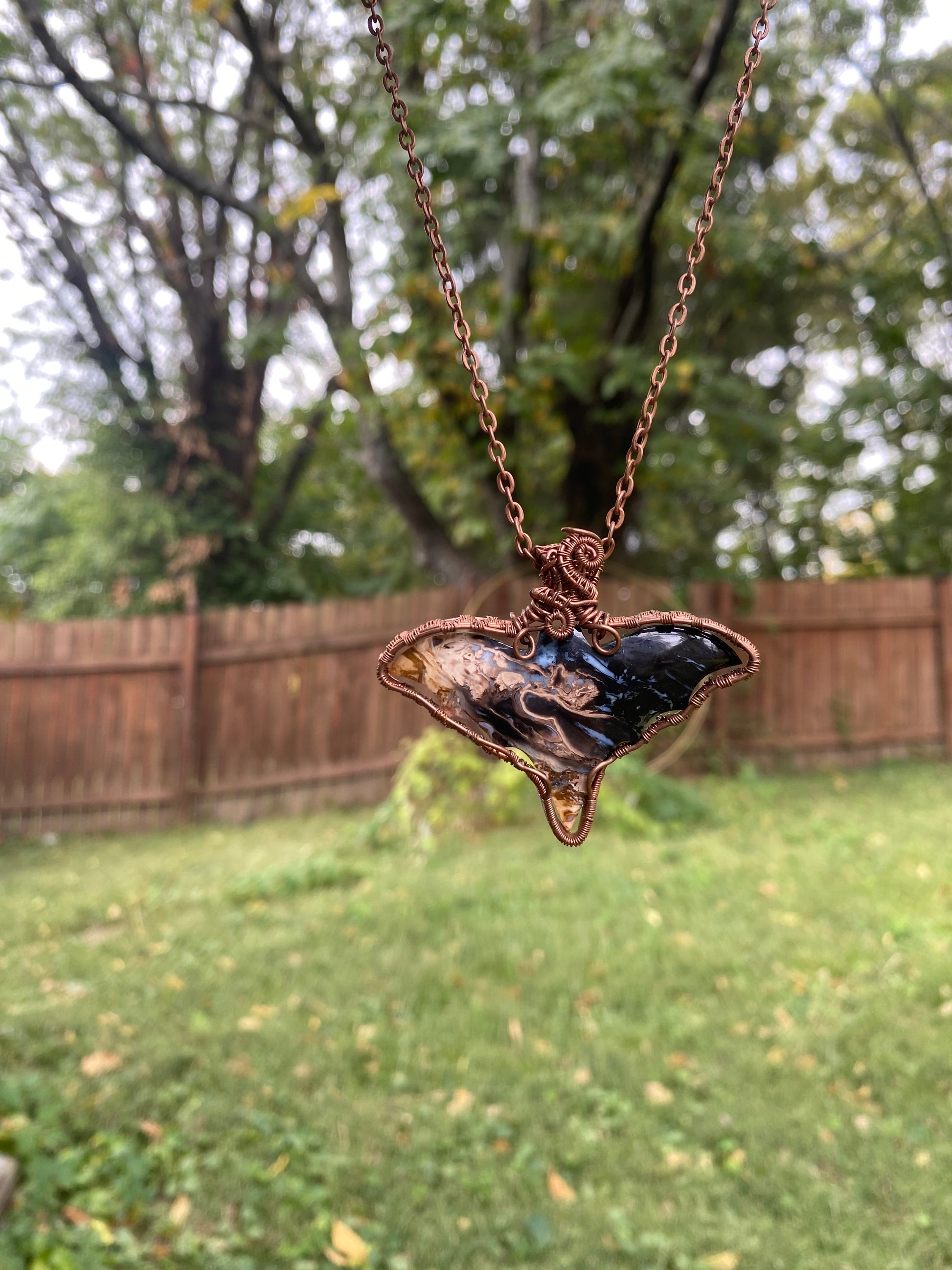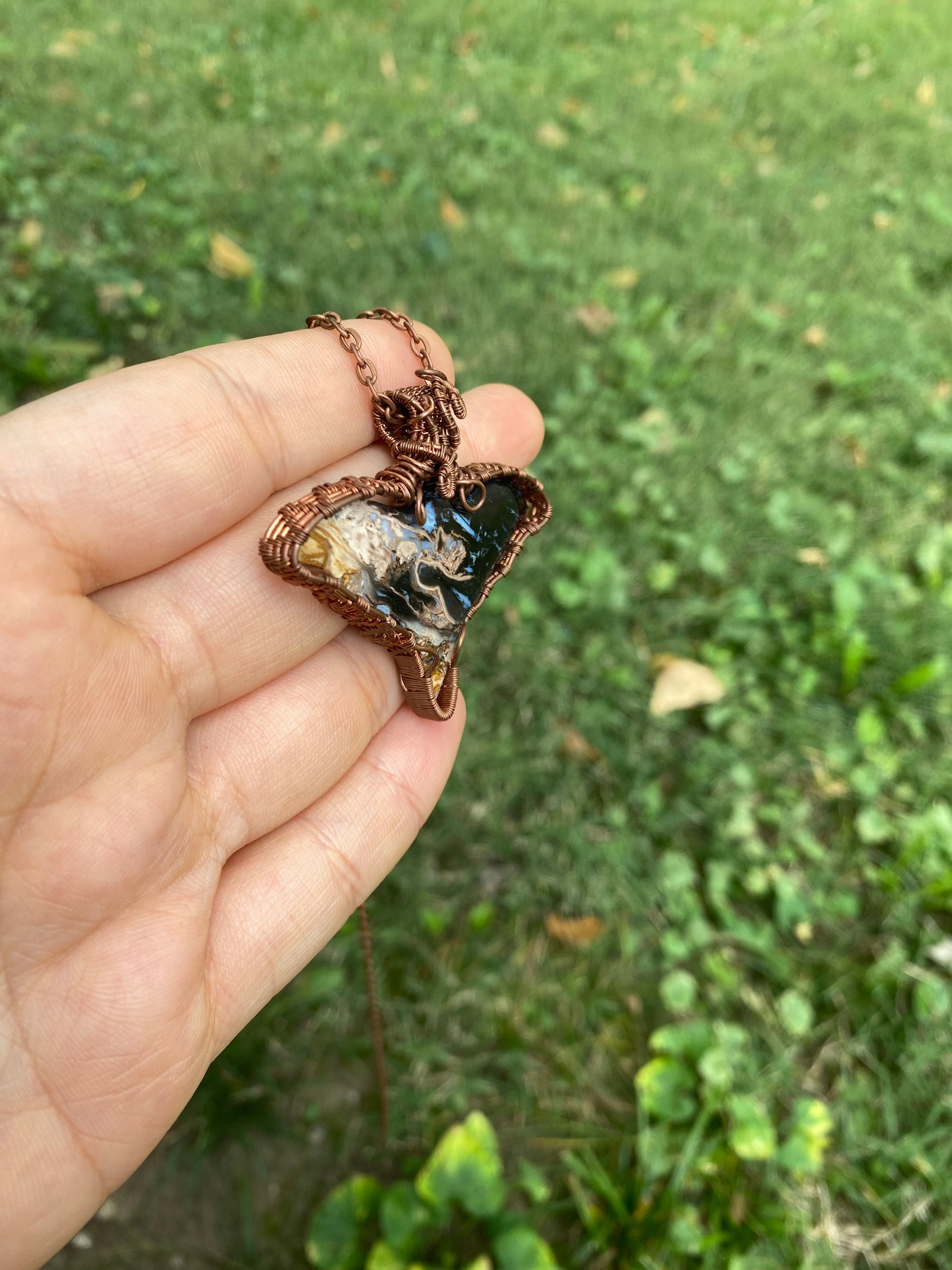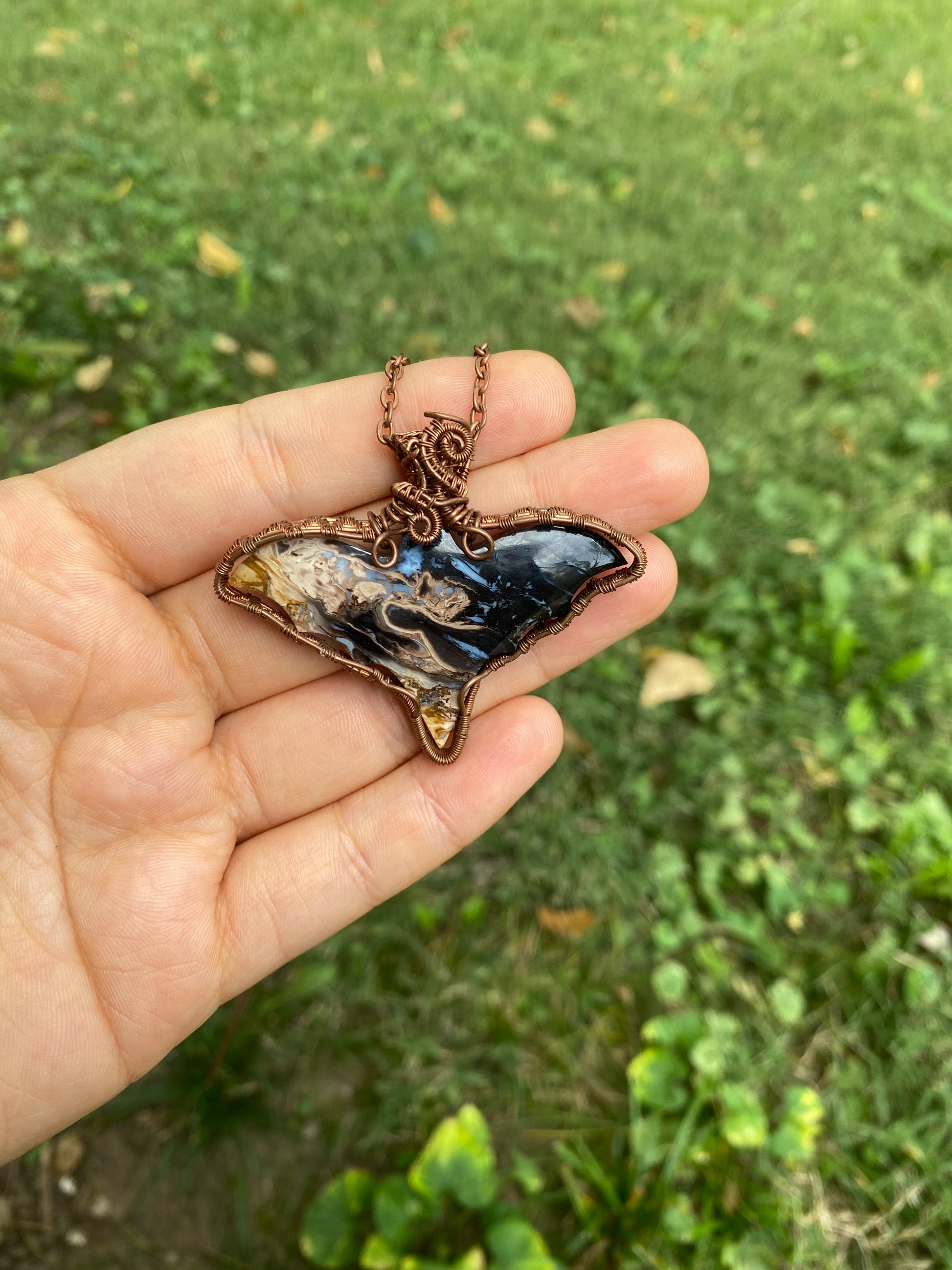 Pendant is approximately 2" x 2.5" and is wrapped in bare copper, it will oxidize over time. Pendant comes on a 18" chain that is easy to swap out.