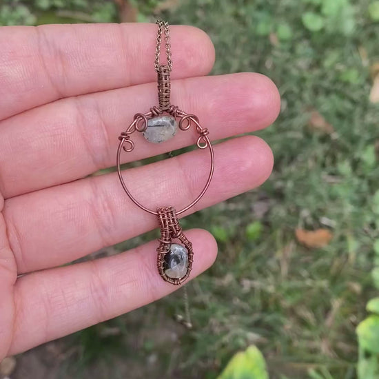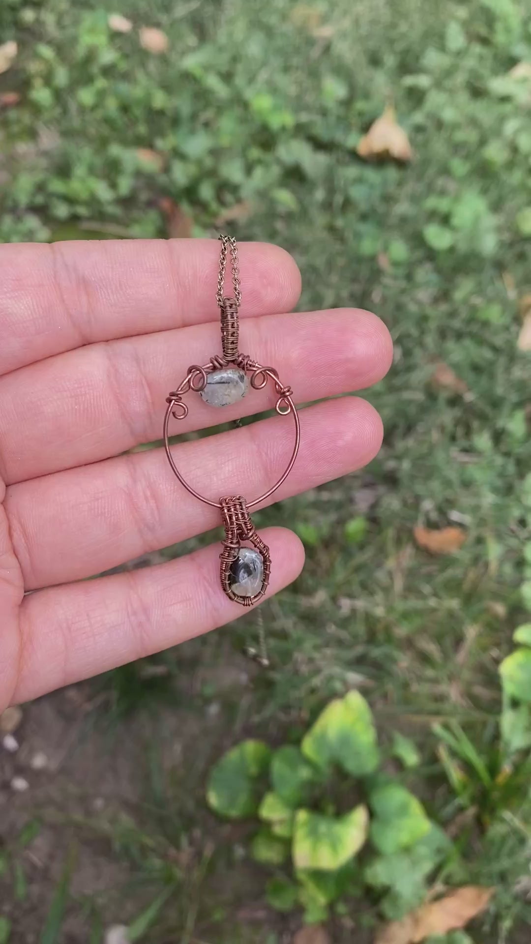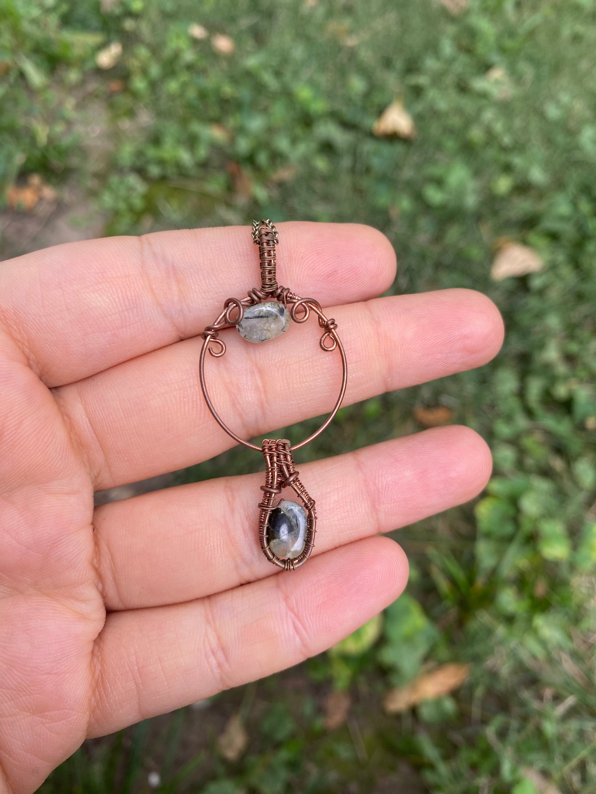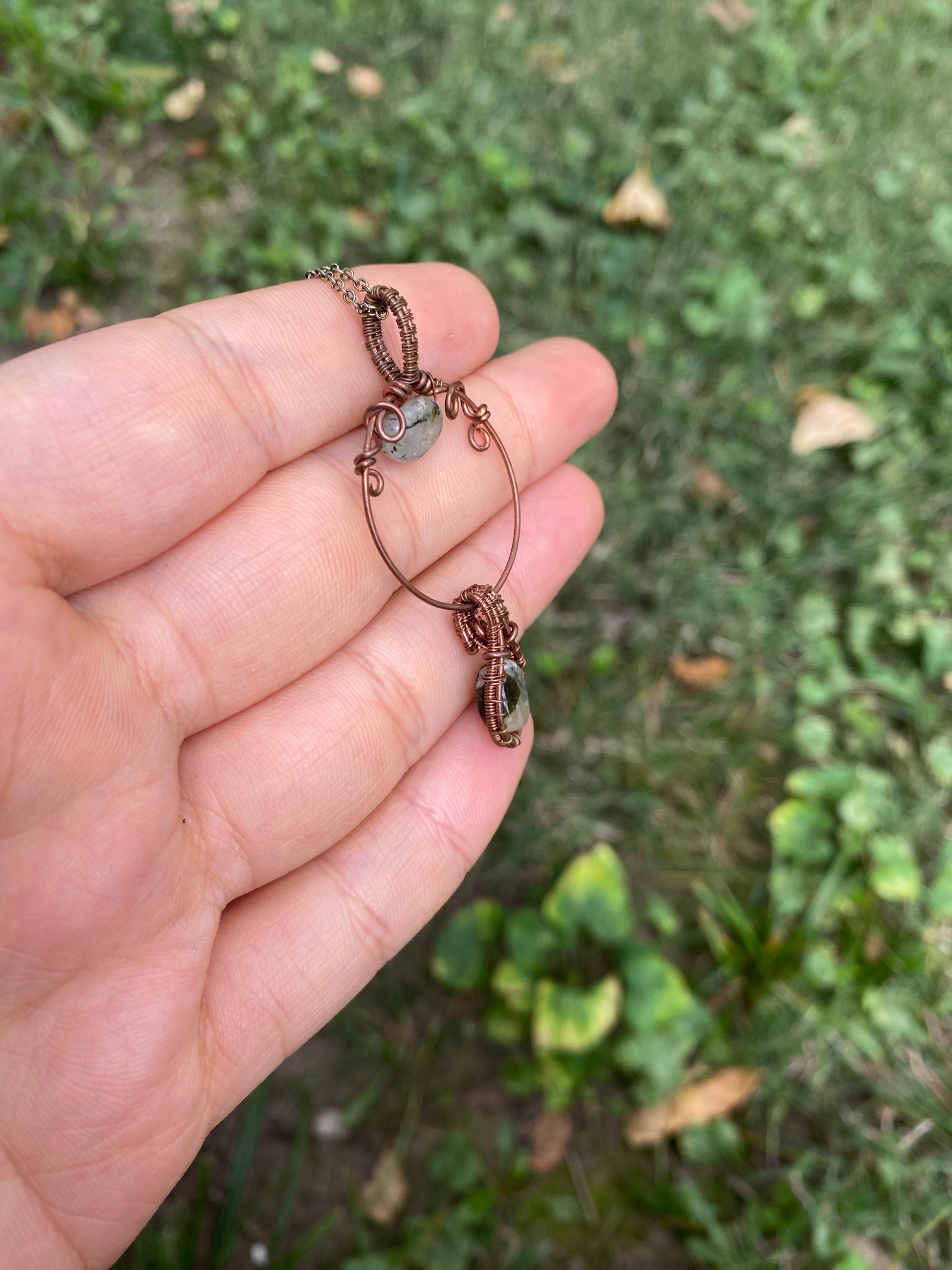 Pendant is approximately 2.25" x 1" wrapped in copper. Pendant comes on 16"-18" chain that is easy to swap out.