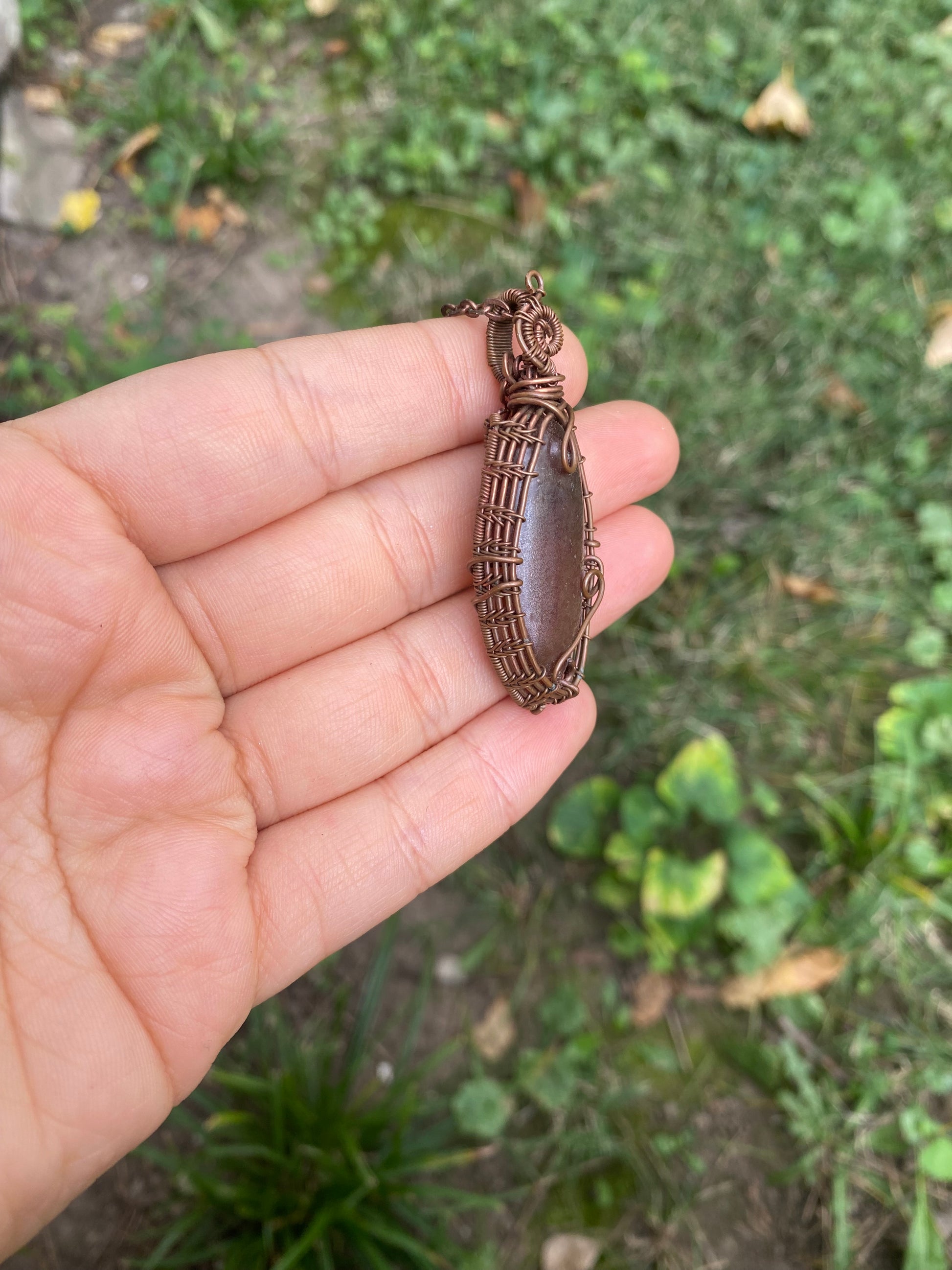 Pendant is approximately 2.5" x 1" and wrapped in bare copper. Pendant comes on a 20" chain that is easy to swap out.