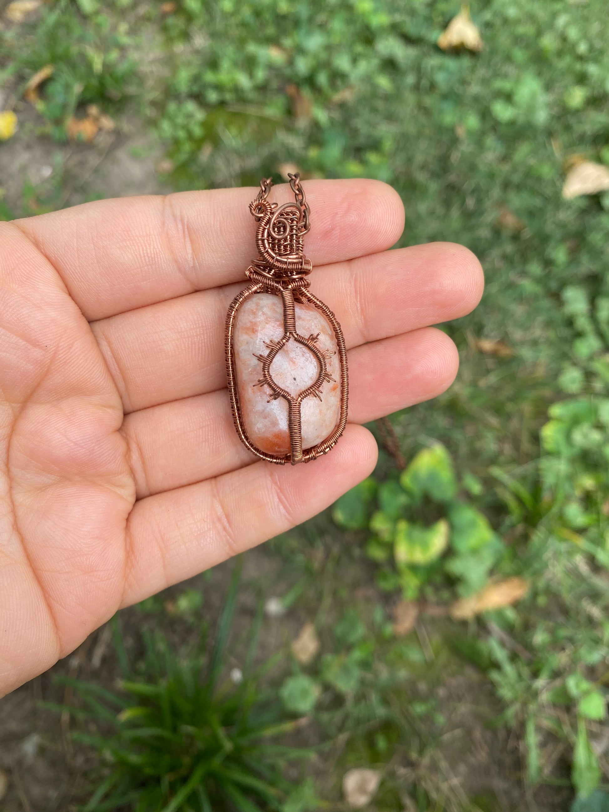 Pendant is approximately 2" x 1" wrapped in copper. Pendant comes on a 20" chain that is easy to swap out.
