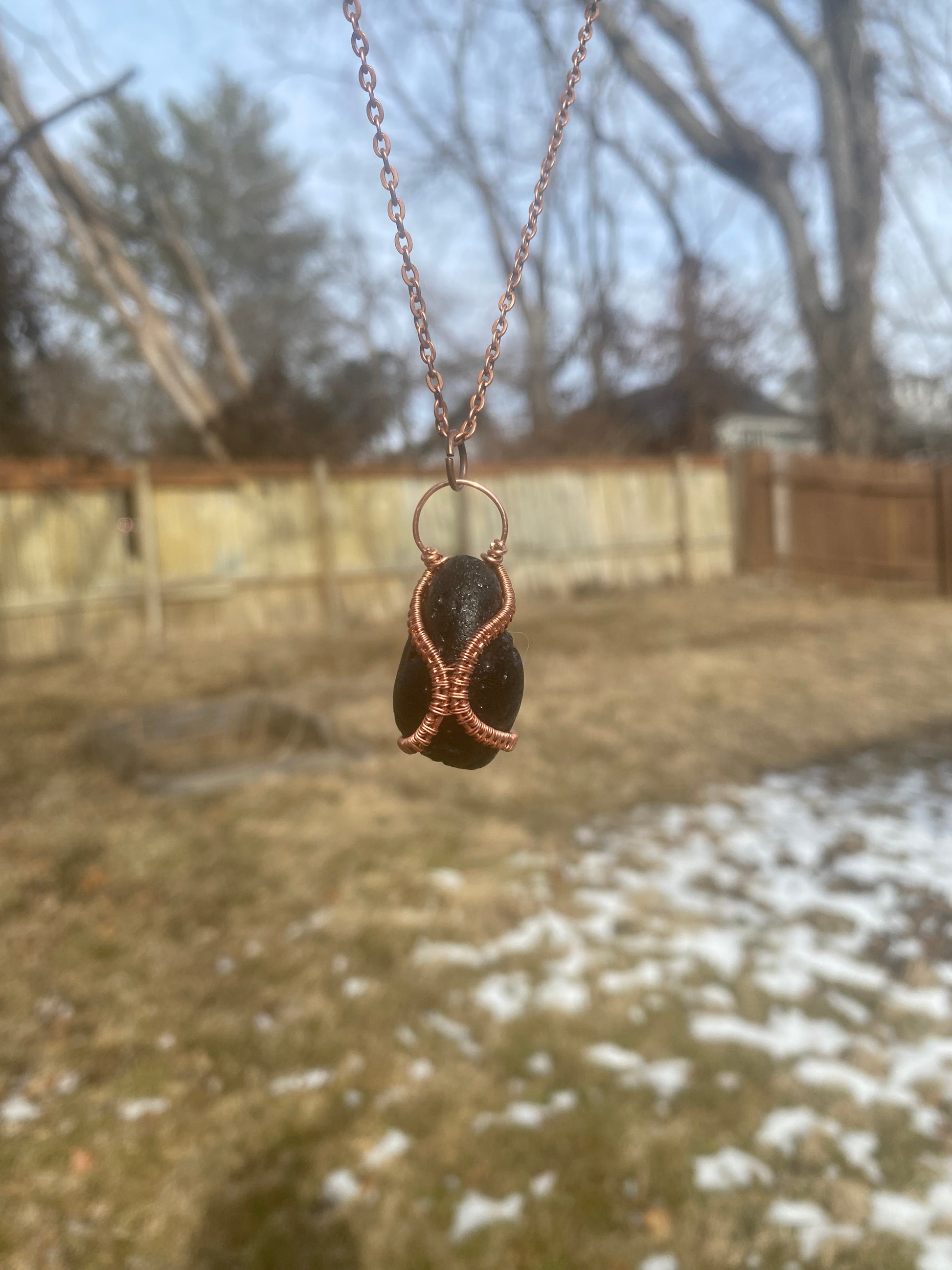 This pendant is approximately 1.5"x.75". Wrapped in bare copper, it will oxidize over time.